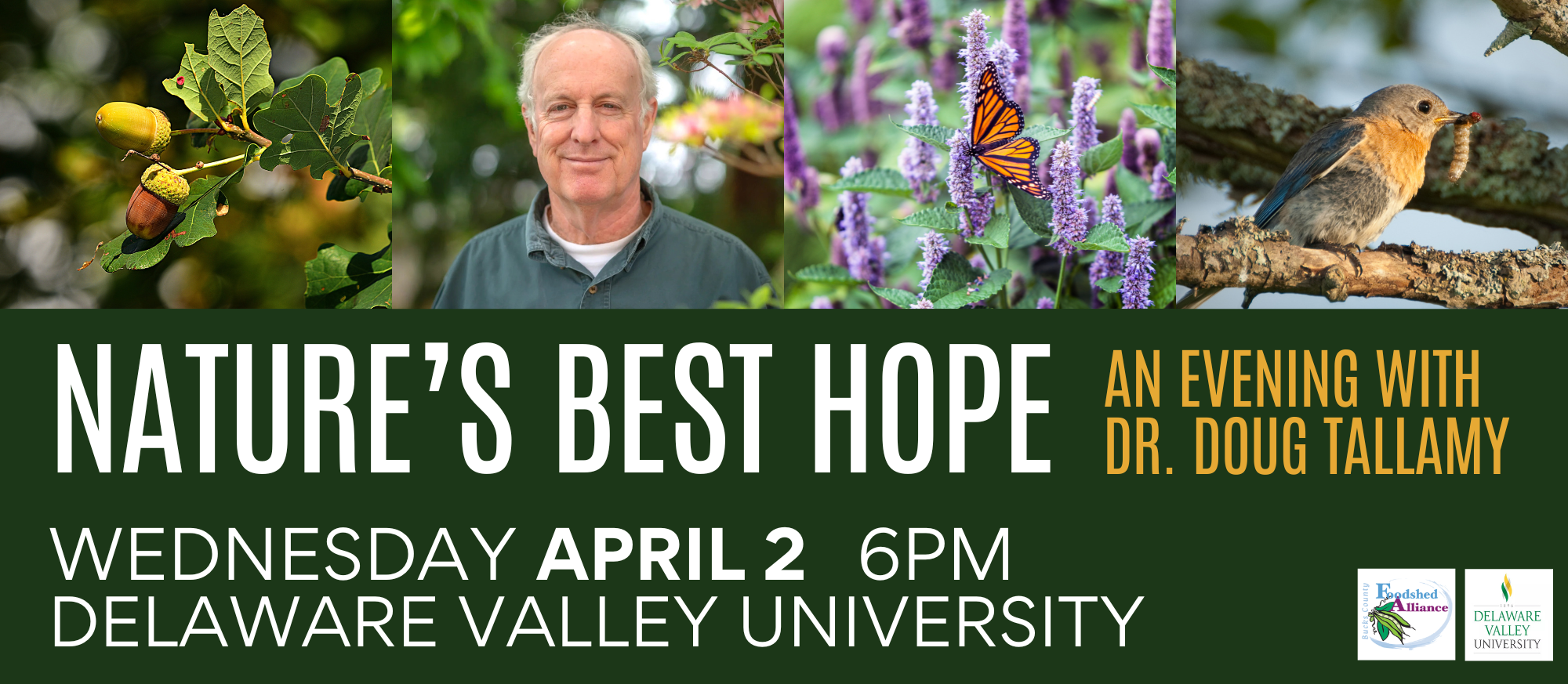 Doylestown, PA (02/13/2025) — Delaware Valley University and the Bucks County Foodshed Alliance are pleased to announce an engaging and educational evening with Dr. Doug Tallamy, a distinguished entomologist and New York Times bestselling author. Dr. Tallamy will present "Nature's Best Hope" on Wednesday, April 2, 2025, in the Life Sciences Building auditorium at Delaware Valley University.